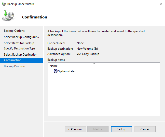 Finally, we are ready to confirm the Windows Server Backup configuration and backup software options and begin the backup. Click Backup to start the backup process.