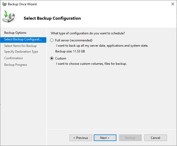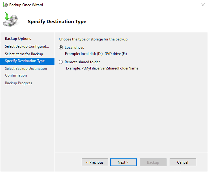 Select the destination type of the Windows Server Backup. These include Local drive backup and Remote shared folder backup.