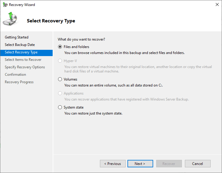 Next, select the recovery type. You can choose files and folders (recover specific files), volumes, and system state.