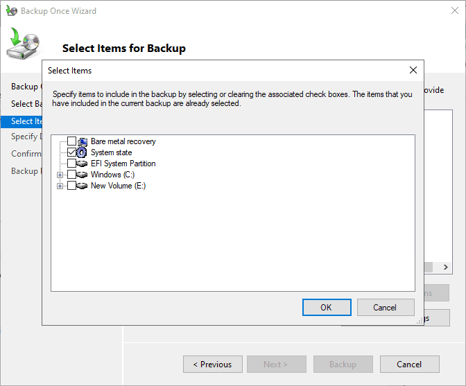 Here we are selecting system state backup job for the items we want to back up. In case you may be wondering what a system state backup contains. It contains the following: