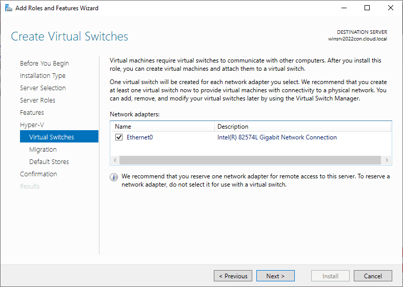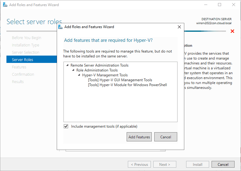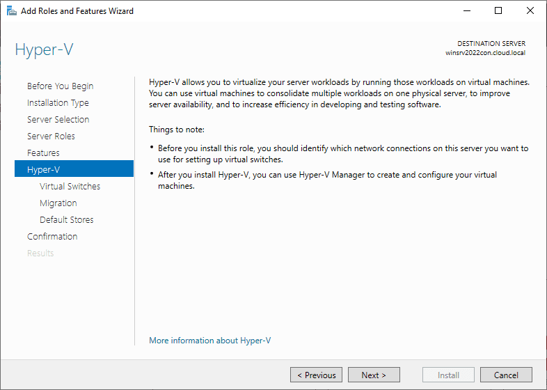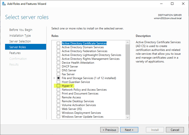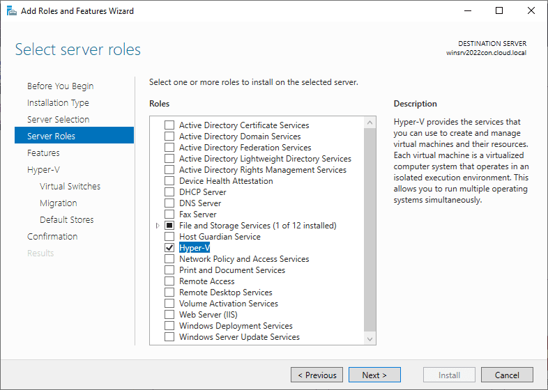 Next, for using Hyper-V isolation, we will need to have the Hyper-V role installed. Let’s quickly look at the Hyper-V role installation. On the Server Roles screen in Server Manager, place a check next to the Hyper-V role. Note you can also use the new Windows Admin Center to install roles in your Windows Server 2022 machine.