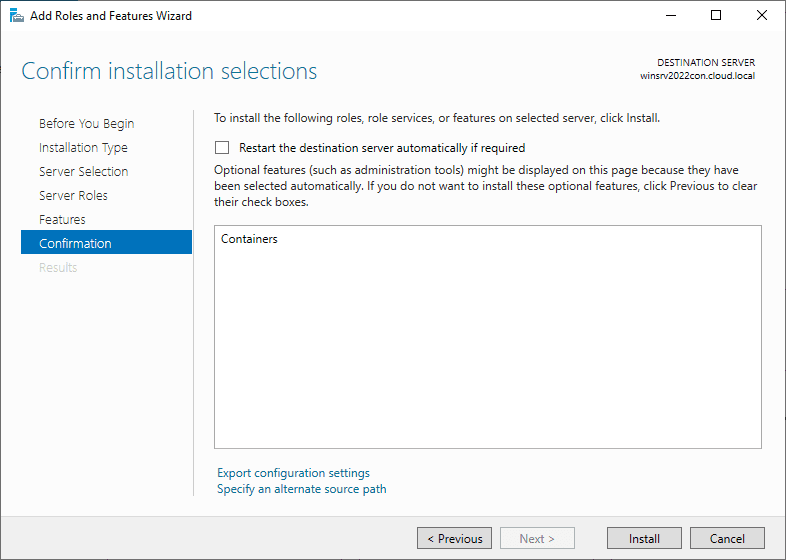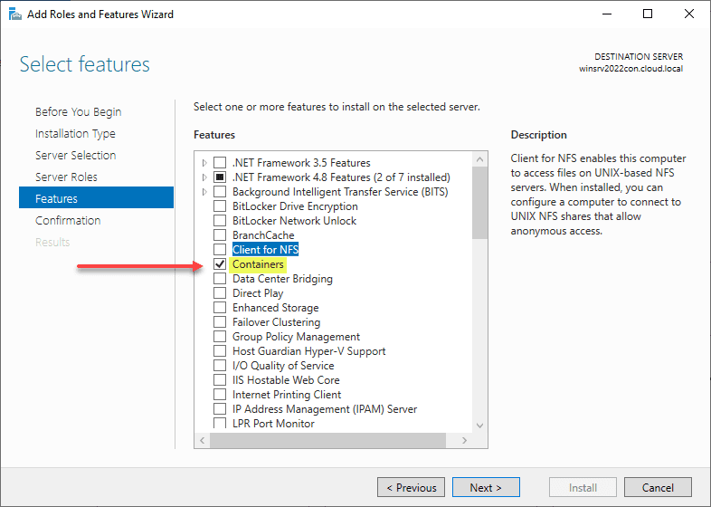 Using the features wizards found in Server Manager, we can install the containers feature in Windows Server 2022 to run containers natively in Windows. The process is fairly straightforward. Run the Add roles and Features Wizard from Windows Server 2022.