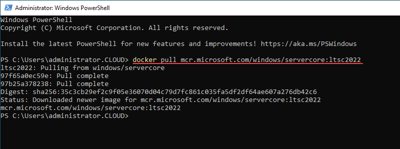 After the Server 2022 host reboots, we can pull the Windows container image in a PowerShell session or Windows Command Prompt: