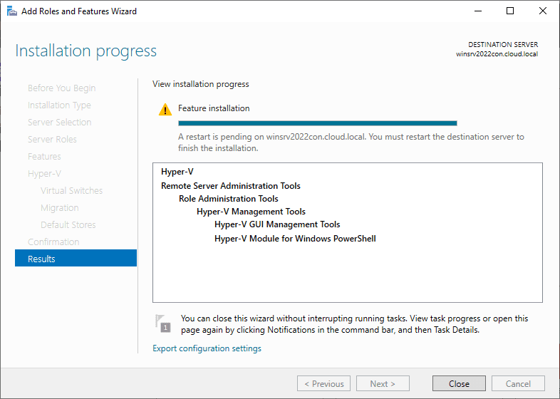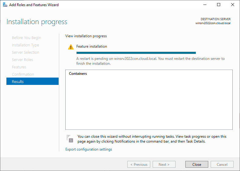 The containers installation is successful. You will be prompted to reboot your Windows Server 2022 host.