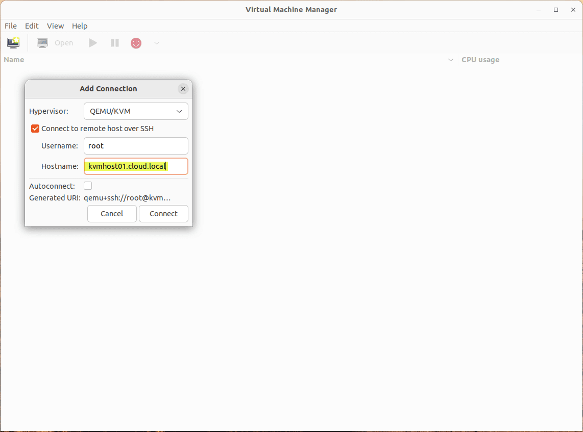 After installing Virt-manager, we can now add a connection to our KVM host.