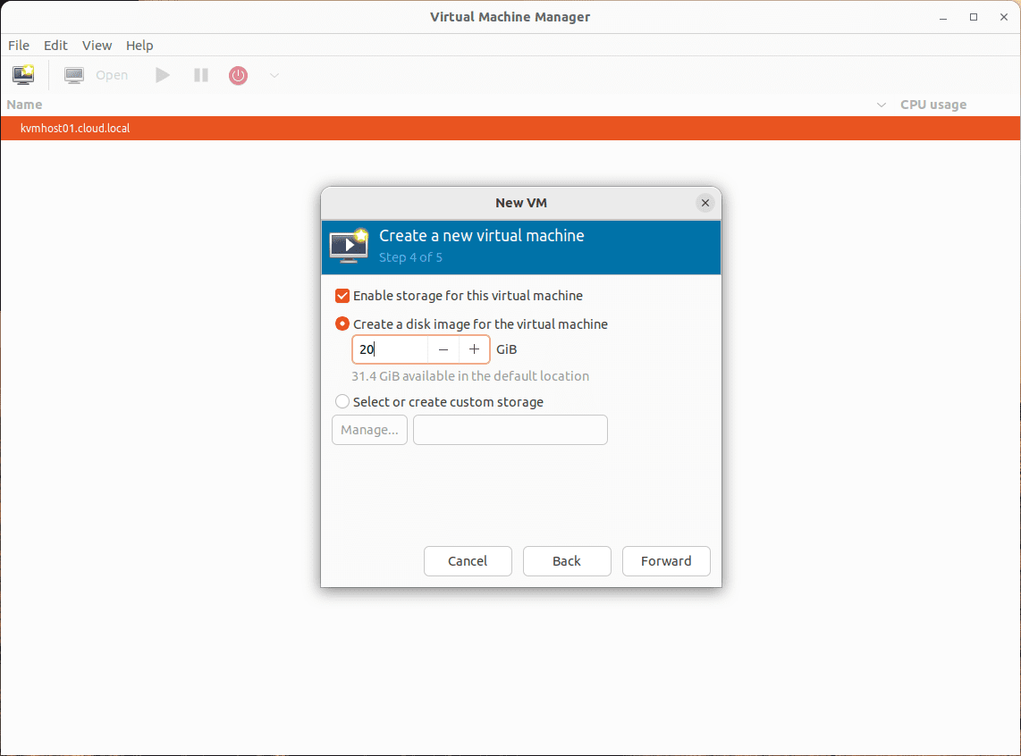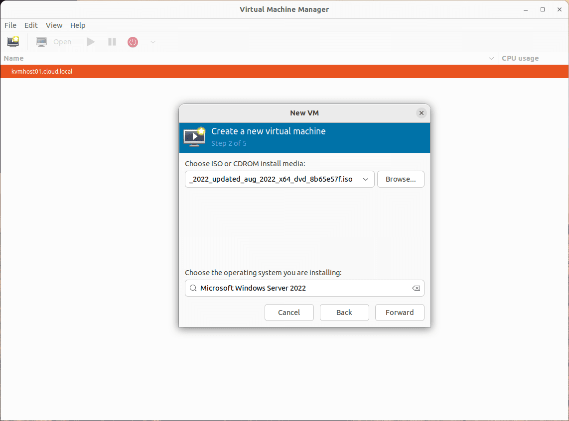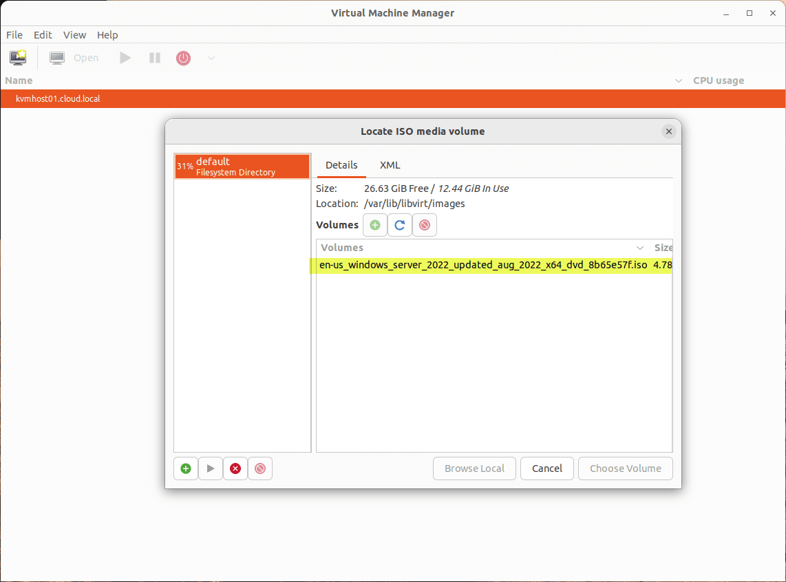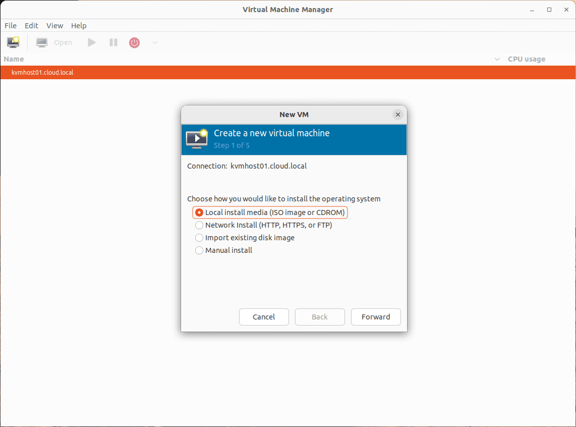 After you have uploaded the ISO file to the KVM host, we can begin the process to create a virtual machine using Virt-Manager.