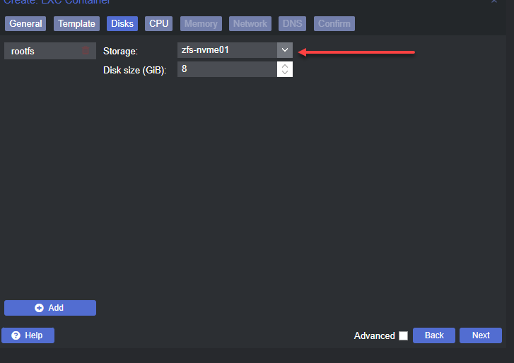 Next, we select the disk storage needed for the LXC container. Below, I have selected the storage for the container file storage using the Proxmox tool.