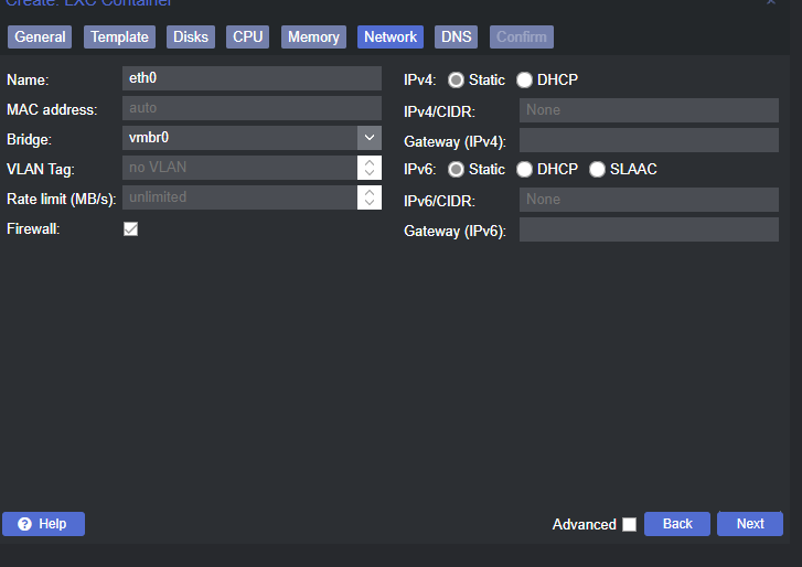 Now, we create network resources for the new LXC container running in Proxmox. The Proxmox containers can have all of the normal virtual machines configuration we are used to, such as assigning a VLAN tag, IP address configuration, such as static or DHCP and others as you would any other computer system running on Proxmox VE.