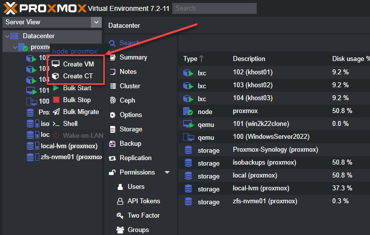You will see the choice in the menu for Create VM or Create CT on the host system. Again the main difference is you are creating a full virtual machine or an LXC container.