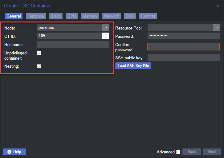 When you choose the New CT option, you will begin the Create: LXC Container wizard. Below you will see the first screen has you define: