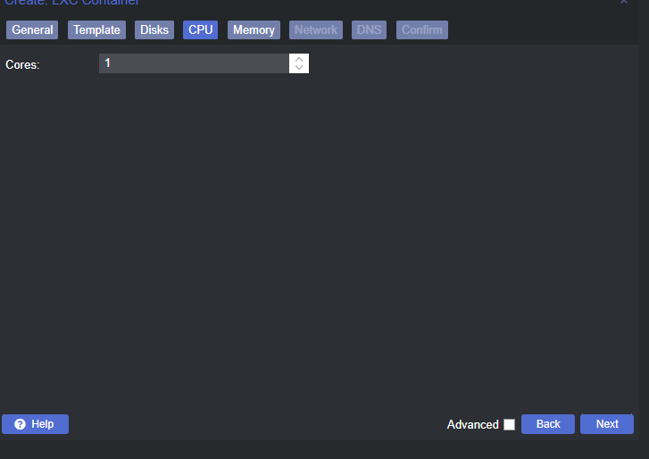Next, we select the CPU resources, needed for the container. We can select the core value needed for the new container.