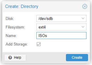 Next, we navigate to the Disks > Directory > Create Directory button in Proxmox. Here we can create the directory we need and format the file storage for uploading ISO files.