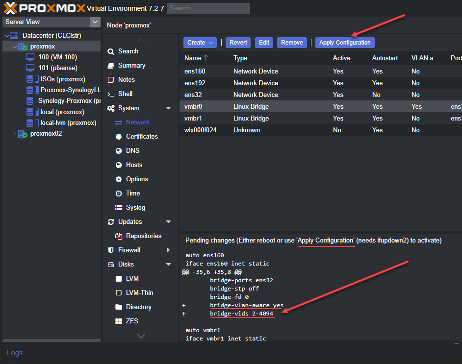 When we edit the network configuration of the Proxmox node, we need to Apply configuration to the network changes. This will apply the changes and restart networking services.