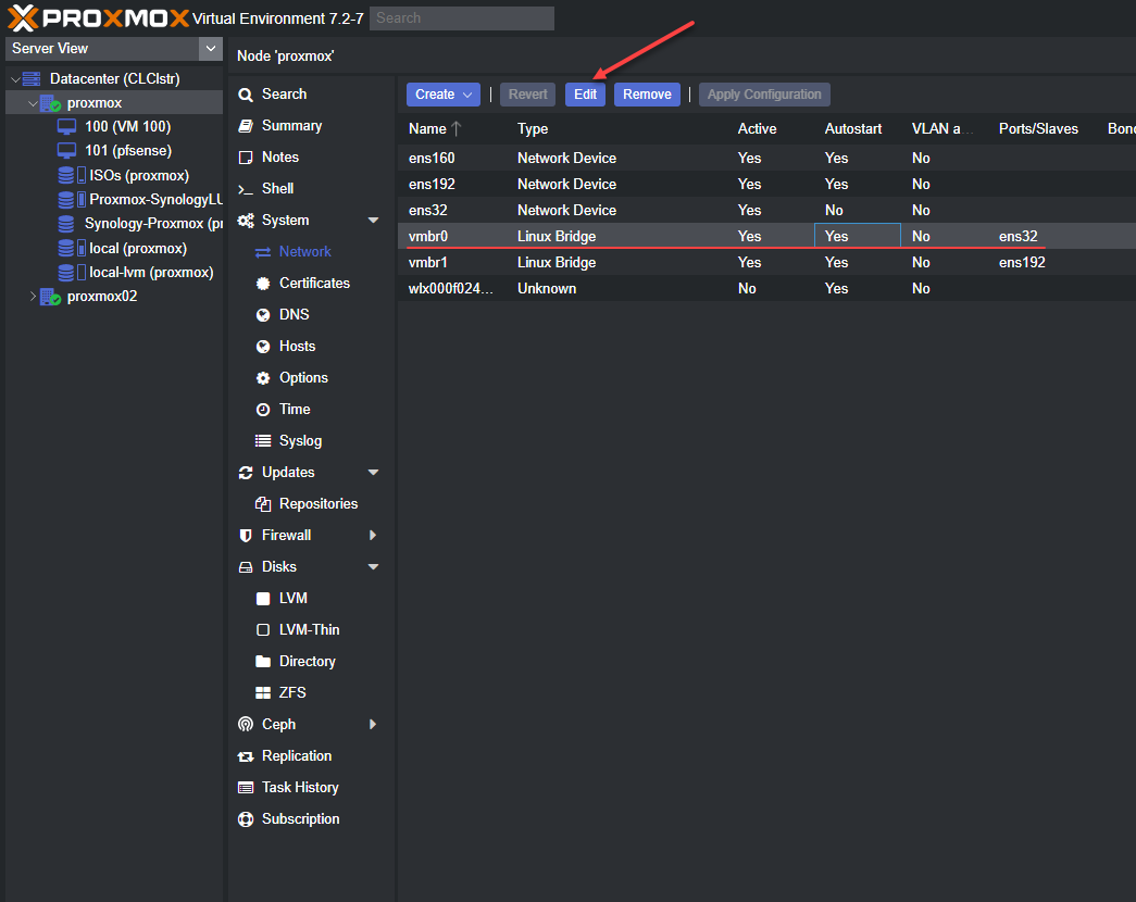 We need to navigate to the Promox host > System > Network and then Edit the properties of the default linux bridge interface in Promox.