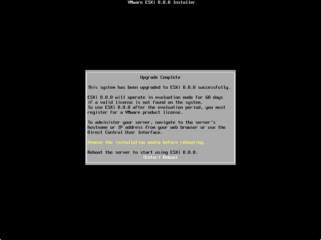 The upgrade process completes successfully. The installer will ask you to remove installation media and then reboot.