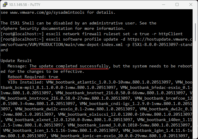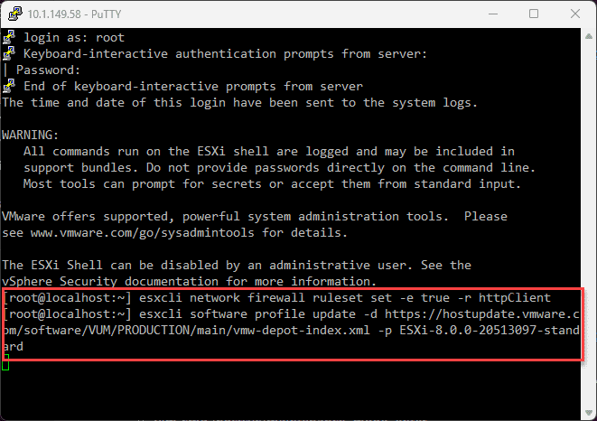 Next, we can upgrade our existing ESXi host using the command line via SSH. This is easily accomplished with only a couple of commands, including the following: