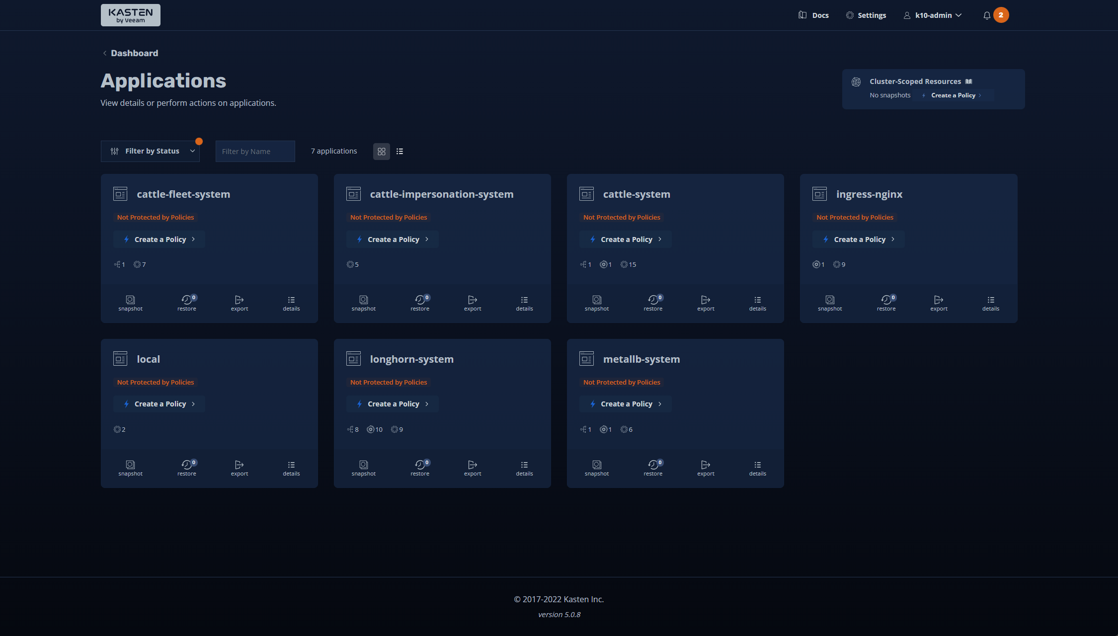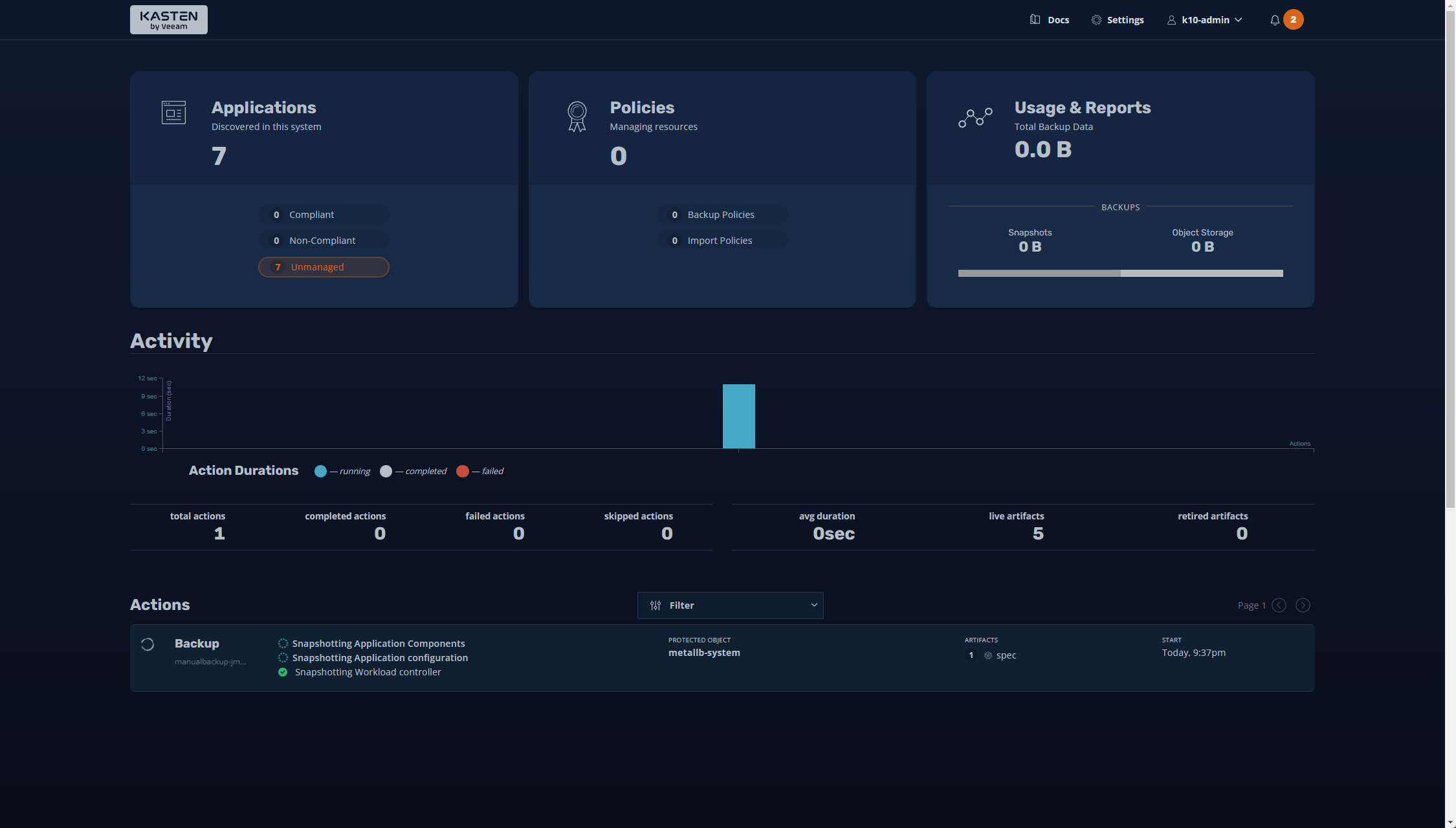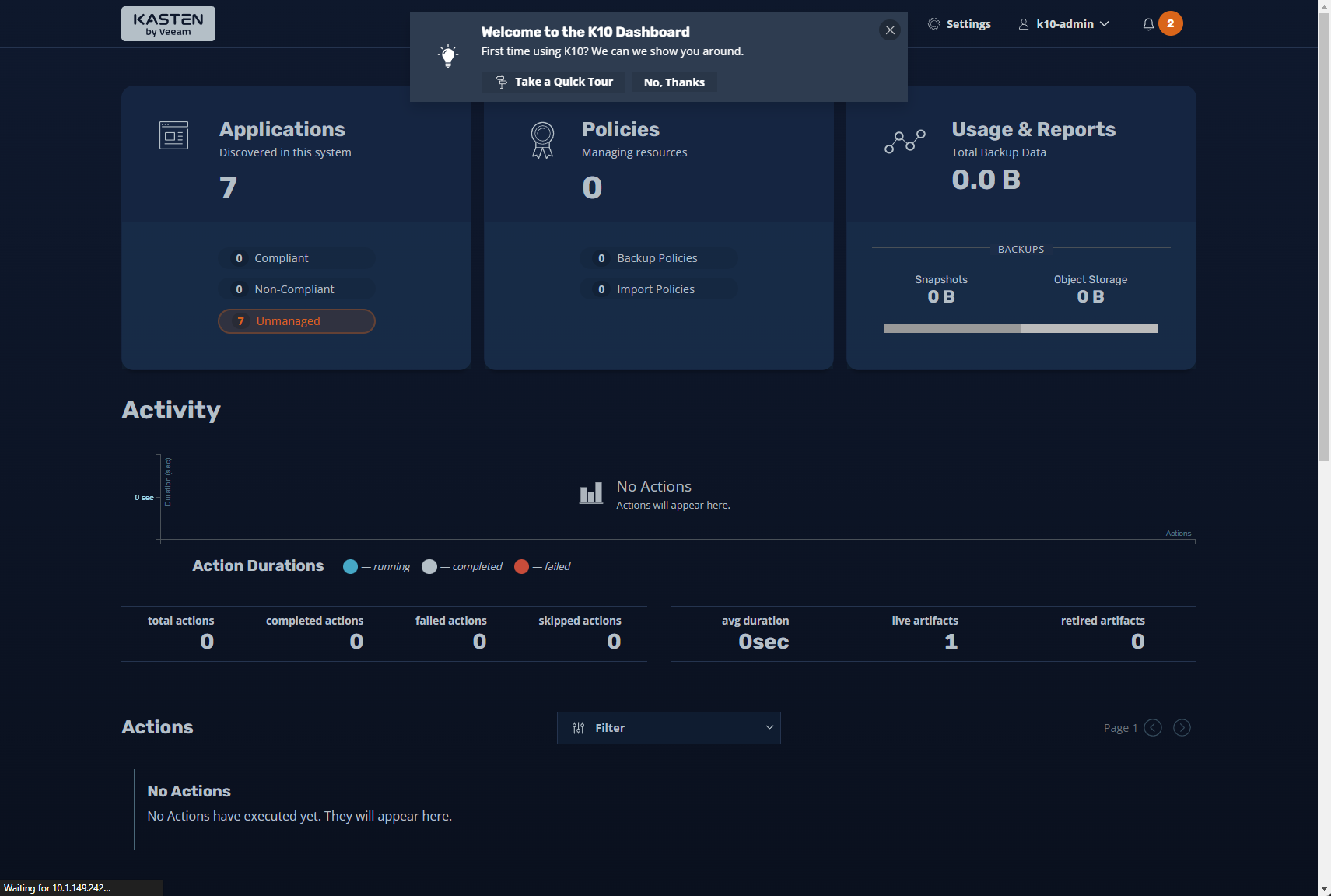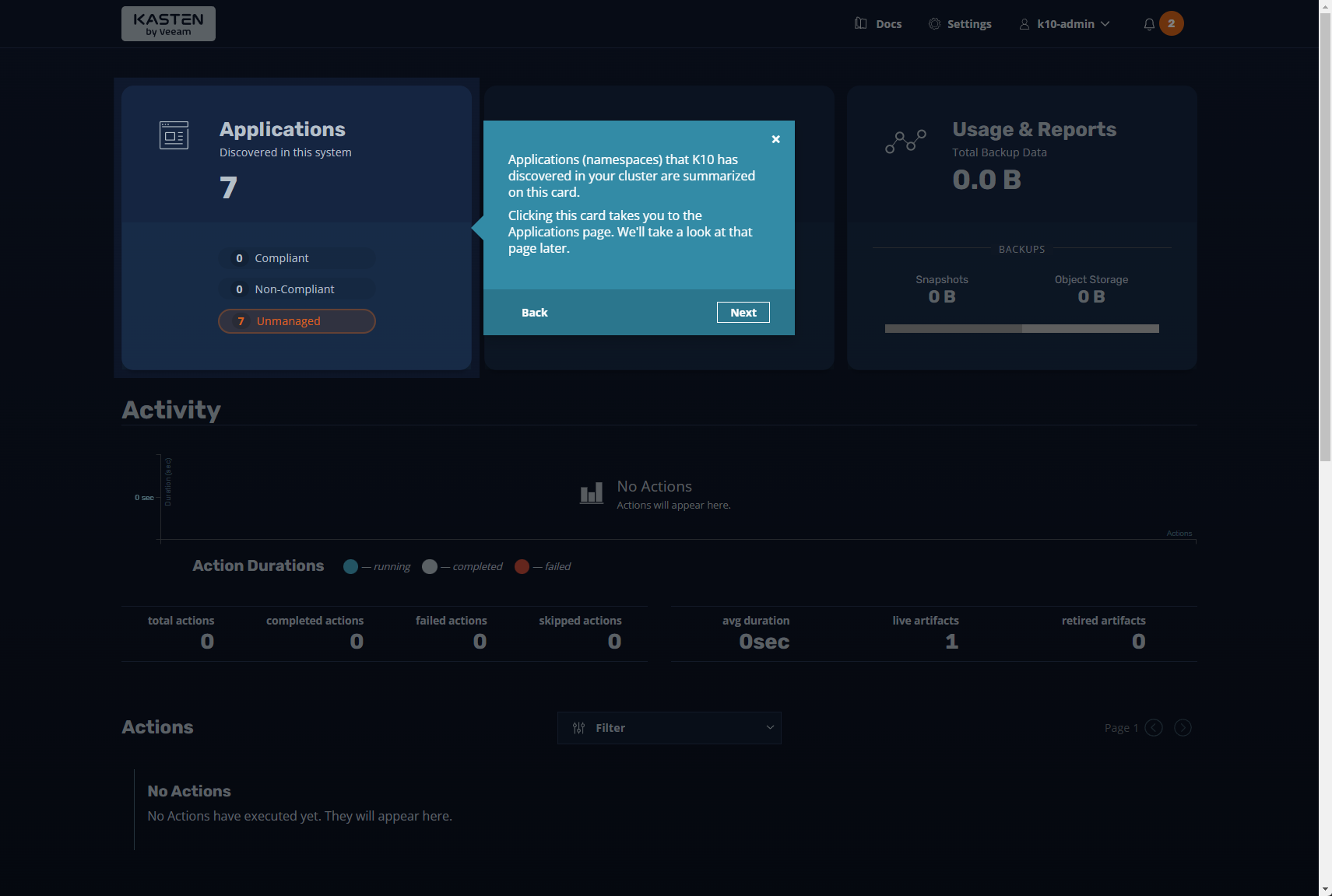 Next, we get to the Kasten application dashboard after the solution’s installation. You can use the Kasten dashboard to manage backups in your environment.