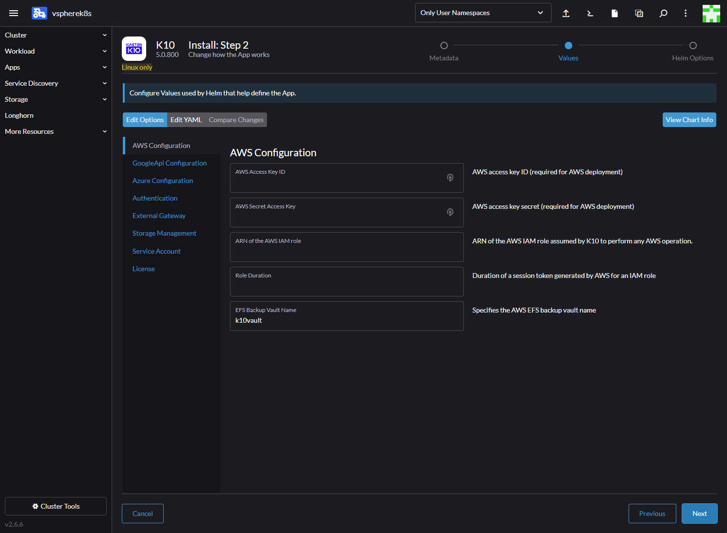 Next, we configure the options for the K10 installation on our Rancher cluster. There are many different components of the installation options, including AWS configuration, GoogleAPI, Azure configuration, External gateway, storage management, service account, license, and others.