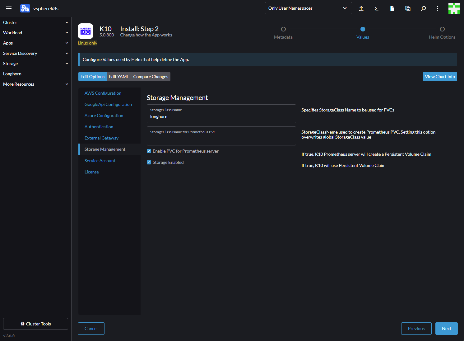 Configuring the options for the kasten K10 installation