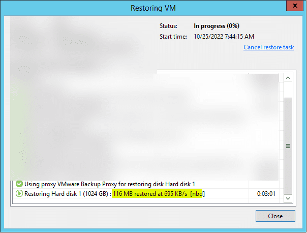 Below is the behavior that I have seen personally. In an environment with no previous issues related to backup, replication, or restore performance over Network Mode, after upgrading to vCenter Server 7, a restore job would kick off and restore painfully slow. Compared to the previous average of 200-300 MBps, the environment saw around 600-800 KBps, yes, kilobytes per second.
