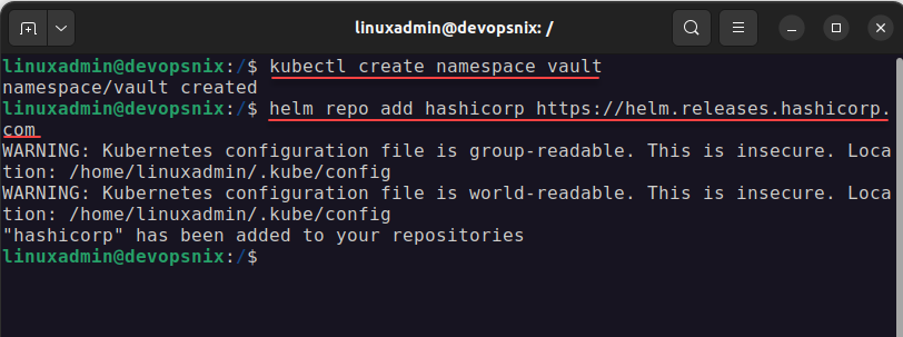 Next, after creating the vault namespace let’s add the helm chart repository for Vault: