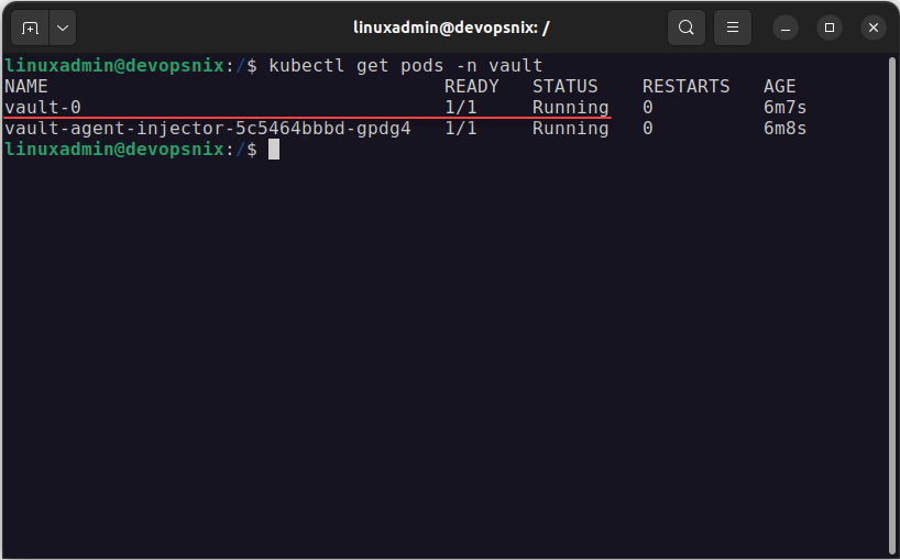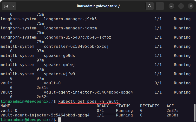 We can now look at the containers and see if they are running in the Kubernetes cluster using the command. This will show the Vault pod and containers running therein.