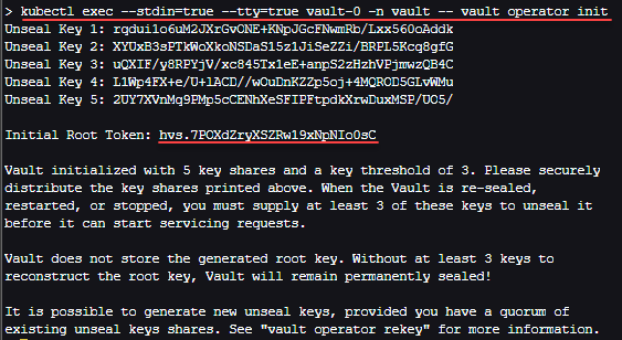 kubectl exec --stdin=true --tty=true vault-0 -n vault -- vault operator init