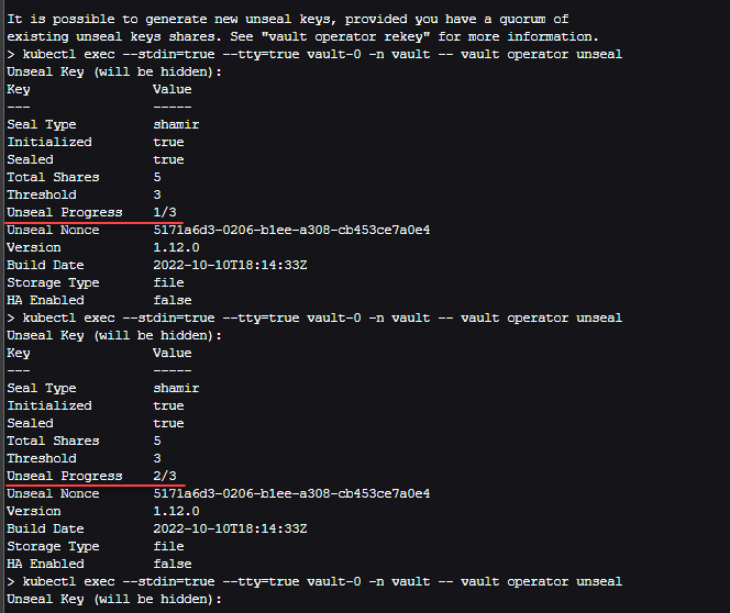 kubectl exec --stdin=true --tty=true vault-0 -n vault -- vault operator unseal