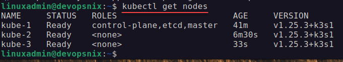 It displays the normal name status roles age version columns with the information from your Kubernetes nodes.