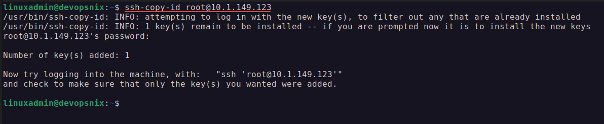 Below, I have created the SSH keypair and I am copying over the SSH key to one of my target servers. This applies to a single-node or multi-master node configuration. Make sure the user you are using has sufficient privileges and in the right security group. This allows us to set up a passwordless authentication less sudo for performing the configuration.