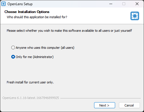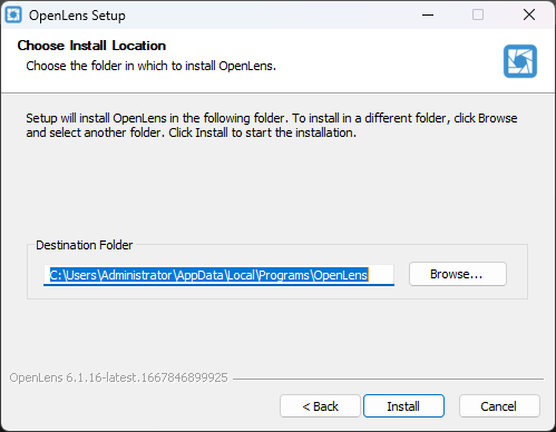 After downloading the latest binary from the link above, installing Openlens is straightforward. Once you download the Openlens installation, it is a simple installer to get up and running.