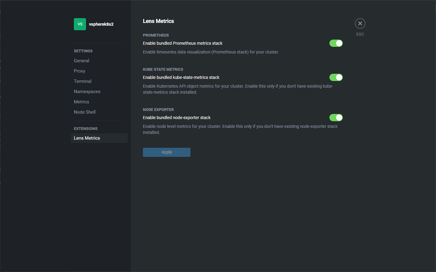 They make this easy. Underneath the settings for your Kubernetes cluster once you are attached, you will see the Lens Metrics entry. Here you can simply toggle the metrics integrations, and Openlens will automatically install the components needed.