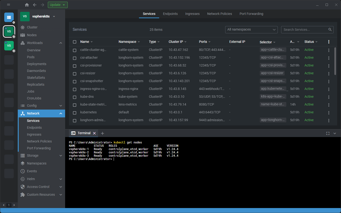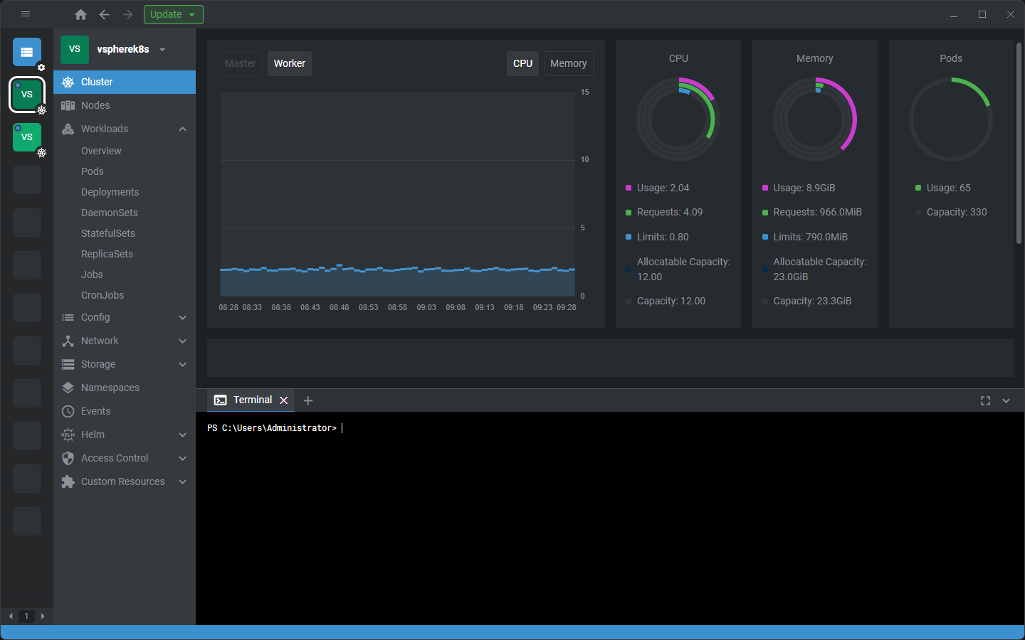 If you notice below too, you will see the Terminal open. One of the really cool things about Openlens and Lens is they allow you to launch a terminal to that specific cluster based on your kube config, without having to change that out between sessions. It reads the .kube directory and enumerates all config files you have there and simply uses these to attach to your specific cluster you are working with.