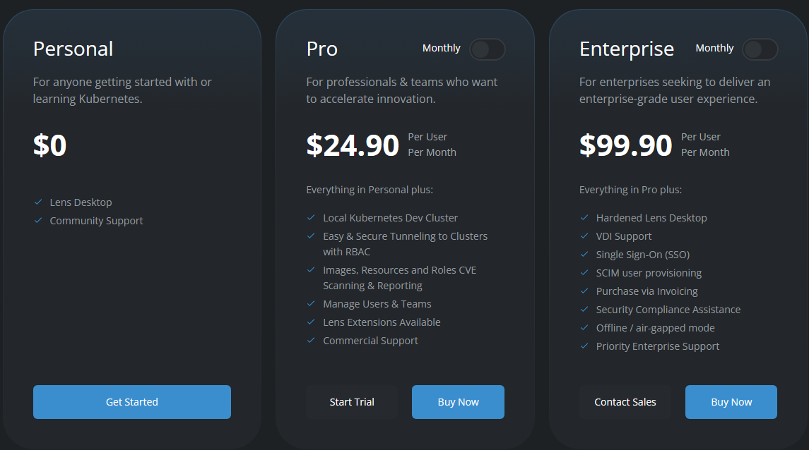 Lens Pro – This is a $24.90/month license or yearly license cost that includes: Lens Kubernetes Dev Cluster, Easy & Secure tunnelling to clusters with RBAC, images, resources, and roles CVE scanning & reporting, Lens Extensions Available, commercial support and other features.