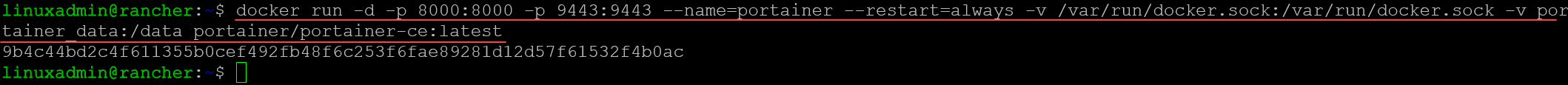 docker run -d -p 8000:8000 -p 9443:9443 --name=portainer --restart=always -v /var/run/docker.sock:/var/run/docker.sock -v portainer_data:/data portainer/portainer-ce:latest
