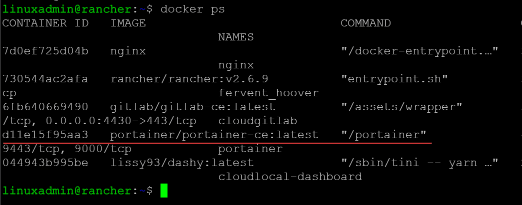 Below, running the docker ps command line returns the currently running portainer container.