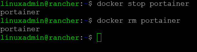 Once the Portainer container is stopped, we can remove the container: