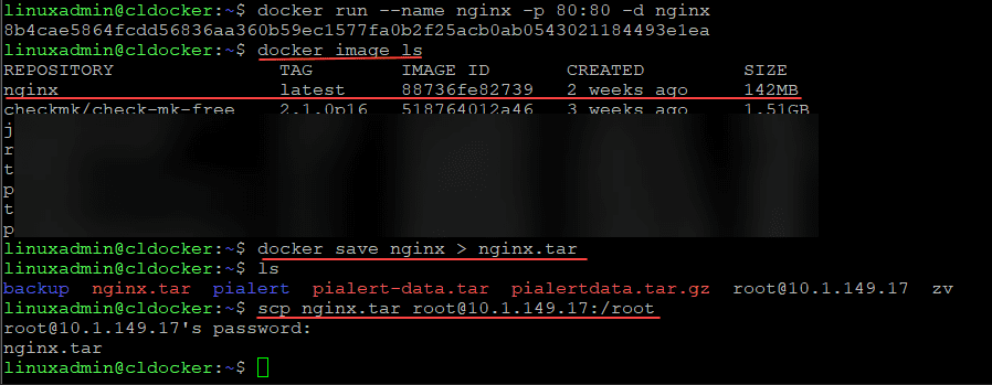 Next, we take a look at the docker images.We can see the nginx image listed. After that, we are using the docker save command to compress the image to a .tar file. Finally, we use scp to copy the tar file to the destination docker host.