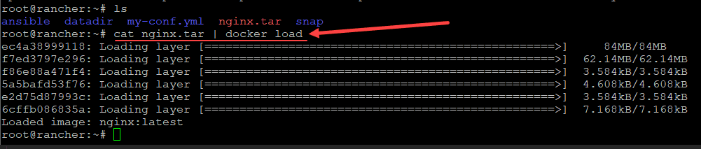 On the destination docker host, we use the command cat nginx.tar | docker load to load the docker image.