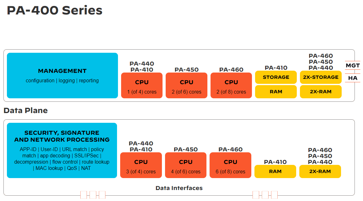 Take note of the following PA 400 series hardware architecture. As you can see below, the PAN PA 440 and other 400 series firewalls use a dedicated management plane with dedicated CPU and data plane processing, including security, signature, and network processing.