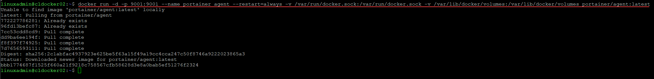 docker run -d -p 9001:9001 --name portainer_agent --restart=always -v /var/run/docker.sock:/var/run/docker.sock -v /var/lib/docker/volumes:/var/lib/docker/volumes portainer/agent:latest