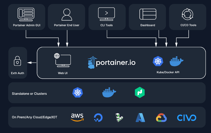 Portainer touts a universal container management platform, allowing you to manage your containers in standalone or cluster mode, on-premises, cloud, edge, IoT, etc.