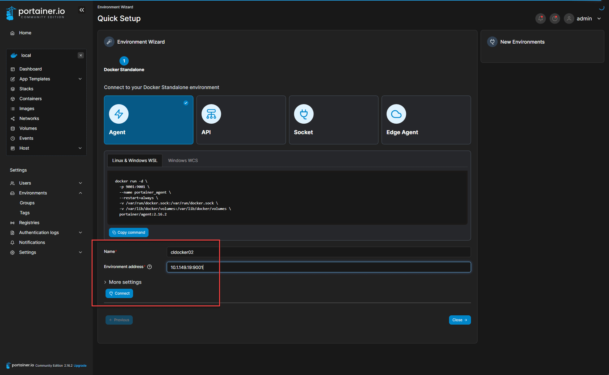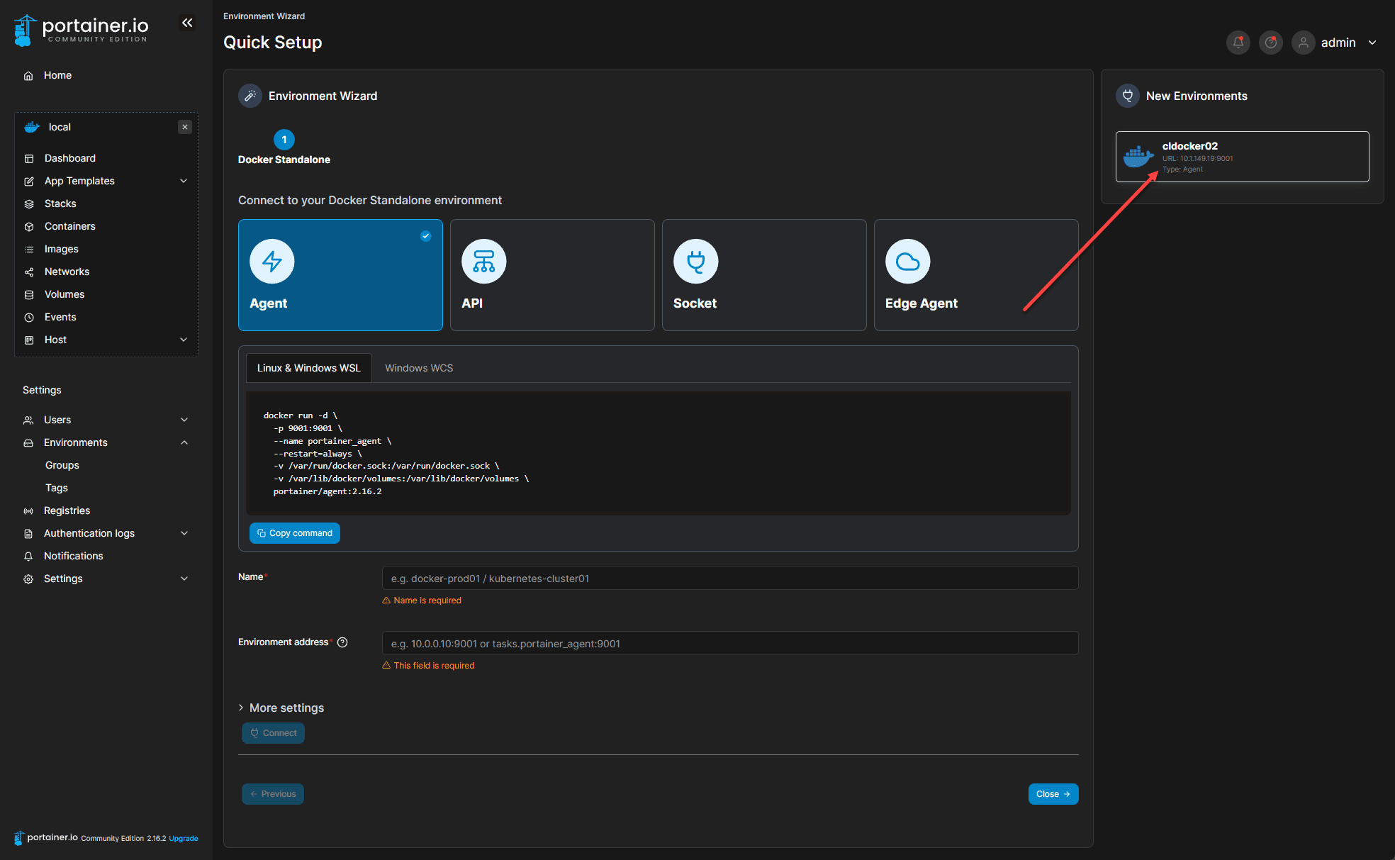 Once you install the Portainer agent on the remote Docker host, you can add the host to your main Portainer instance.