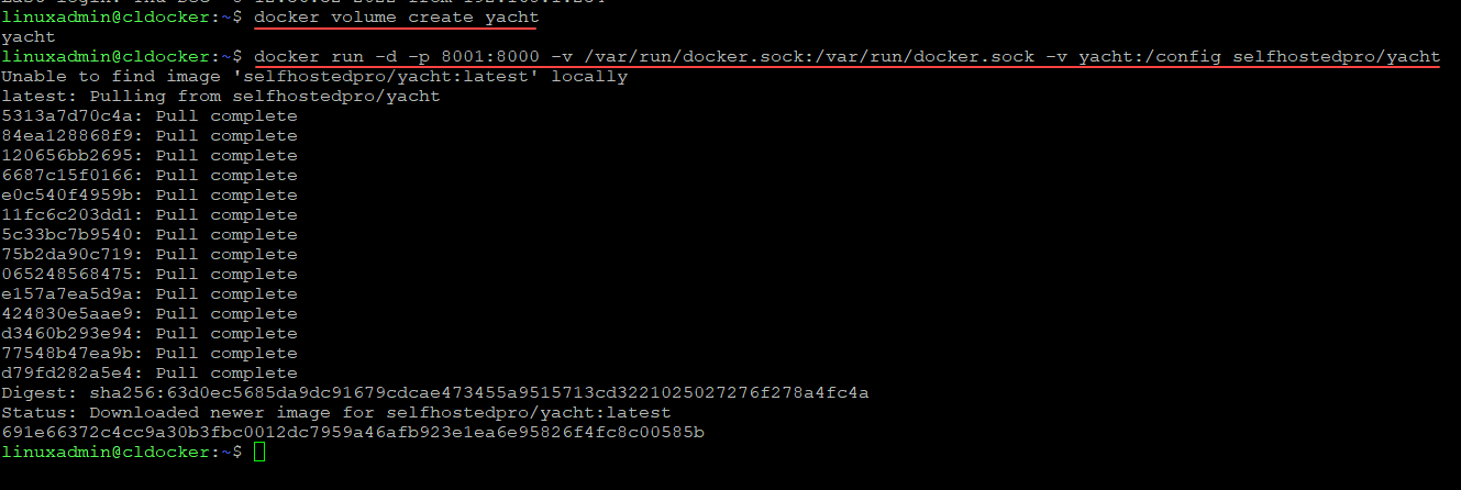 docker run -d -p 8000:8000 -v /var/run/docker.sock:/var/run/docker.sock -v yacht:/config --name yacht selfhostedpro/yacht