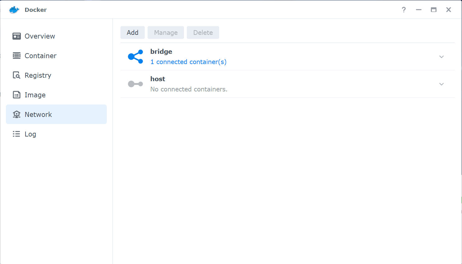 Docker networking from the Synology Docker app. You can see the default Docker bridge and the host network.