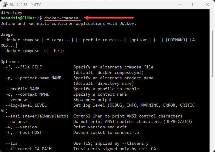 After you have installed Docker, which includes Docker Compose, you can run the sudo docker compose command from the SSH terminal. The sudo user is a member automatically of the docker group. Otherwise, you will get an error response if you do not use the sudo command.