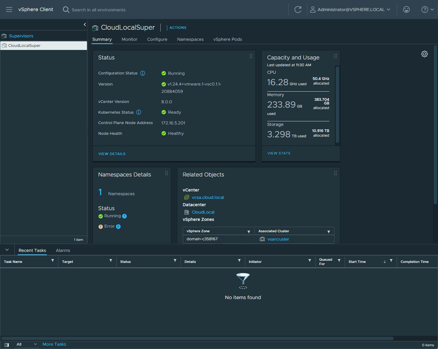 You can think of the supervisor cluster as the control plane for the Kubernetes environment.