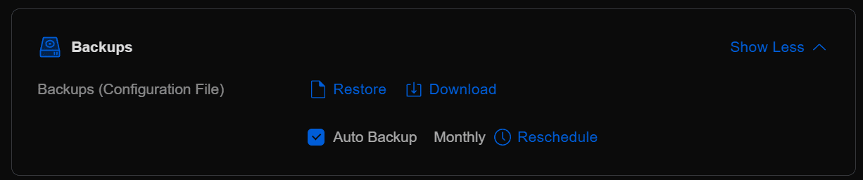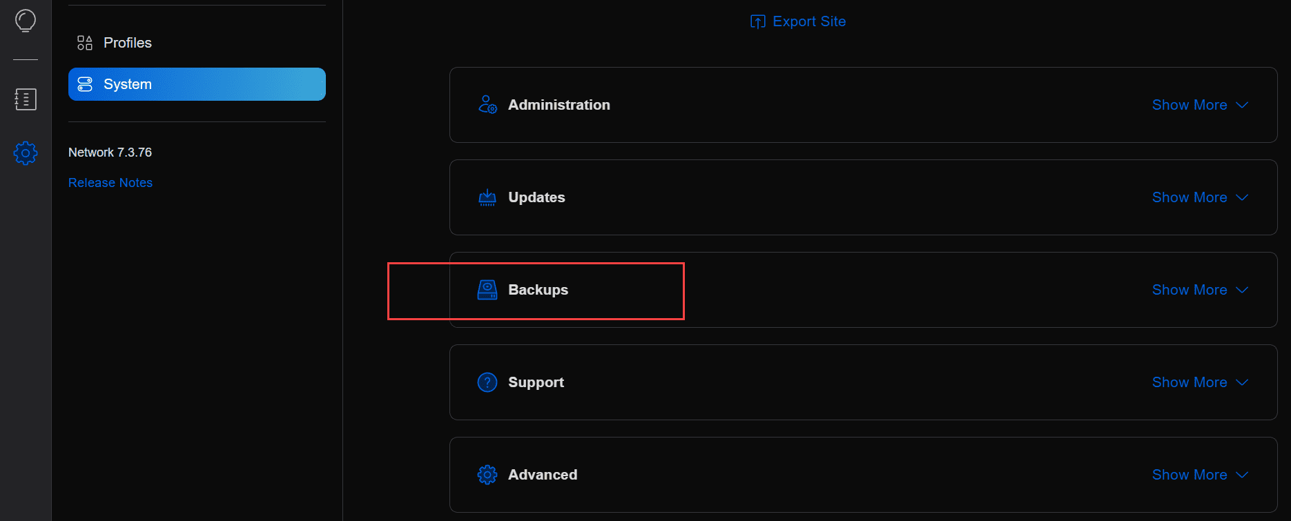 The process to backup your Unifi configuration from an existing installation, whether in a virtual machine, a Docker container, or something else, is straightforward. Under the System menu of your controller you are migrating from, you can select Backups.