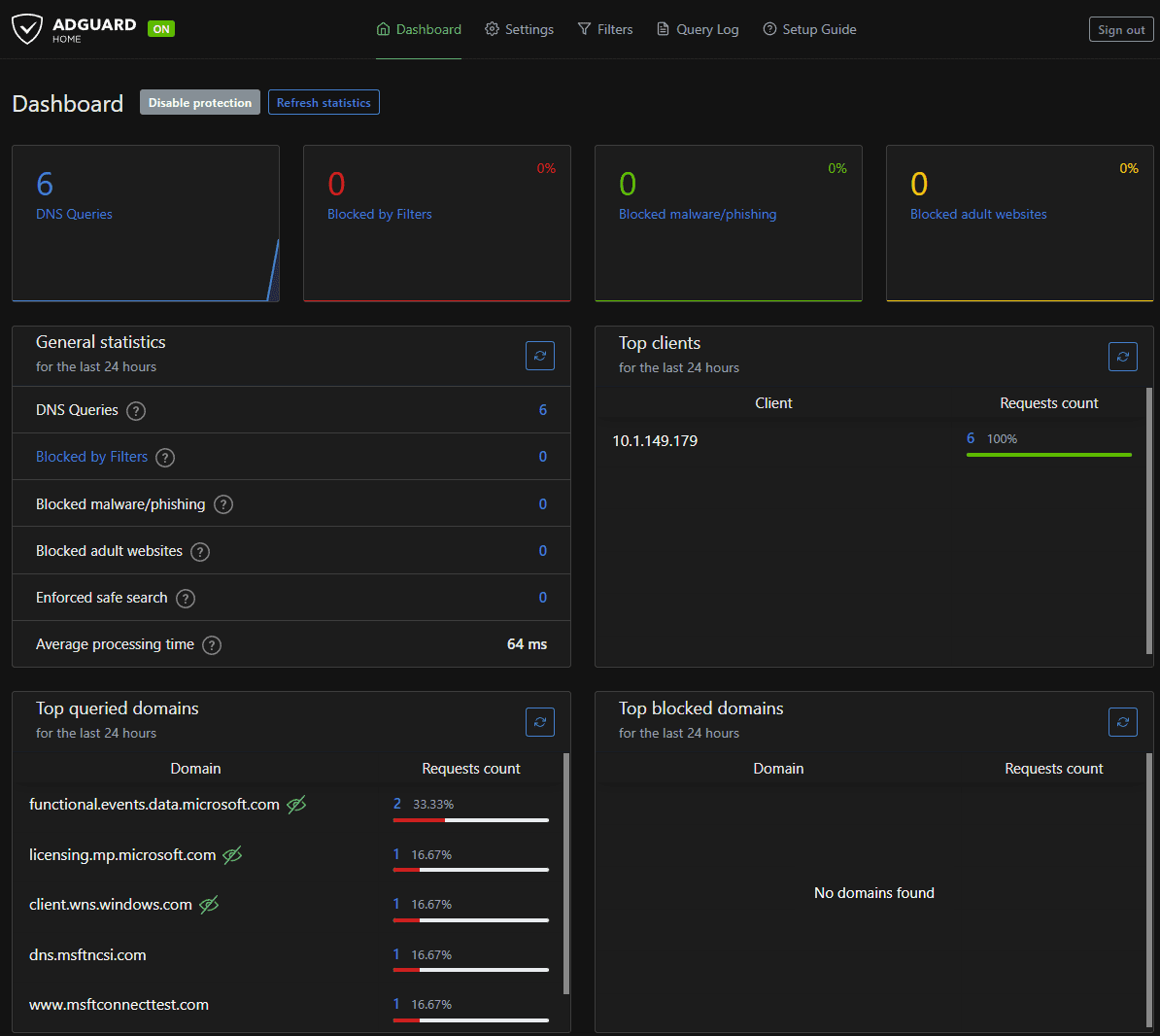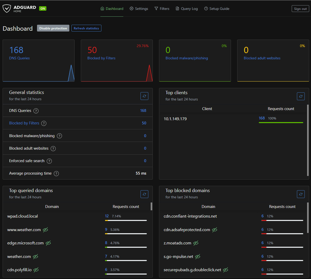 After pointing your first client to the Adguard Home server, you should start seeing the DNS queries in Adguard. It also provides a quick and easy way to disable protection, which is a nice feature.