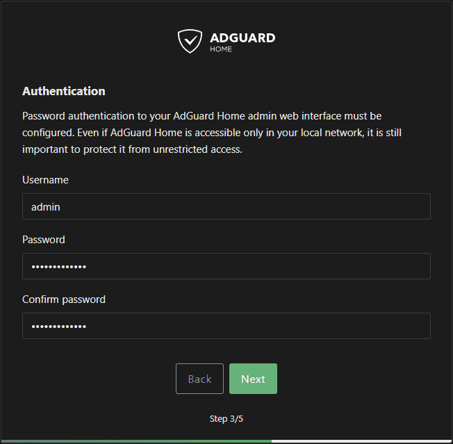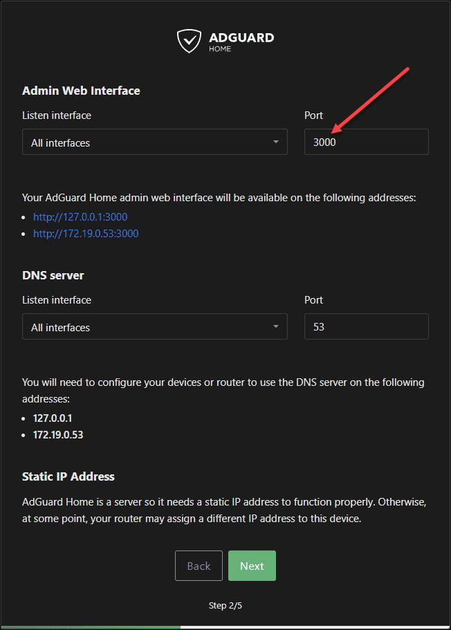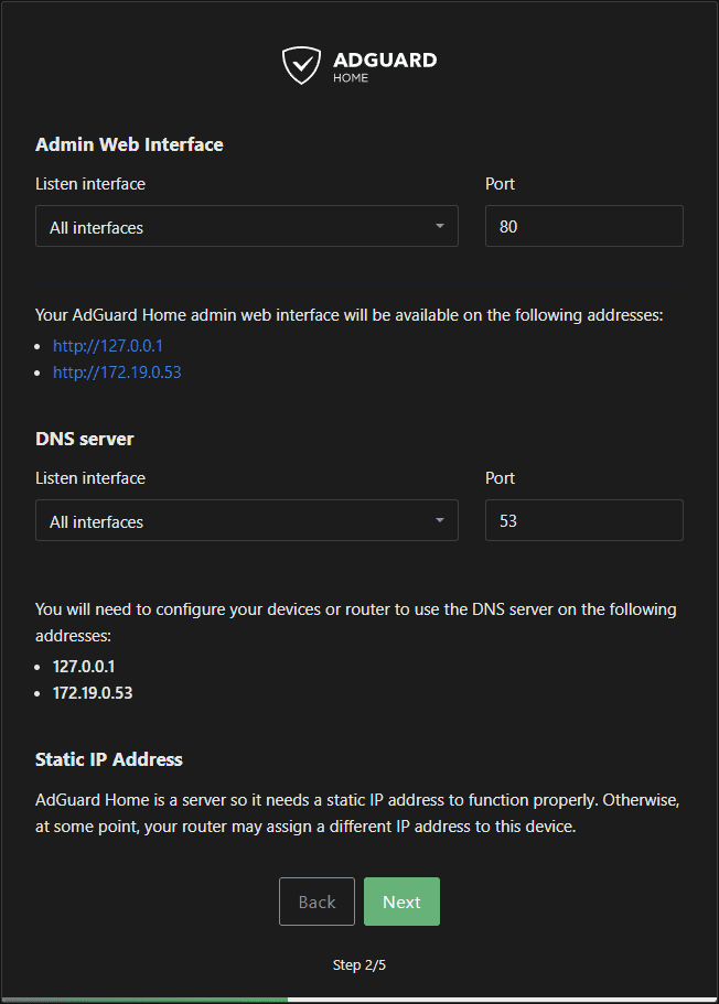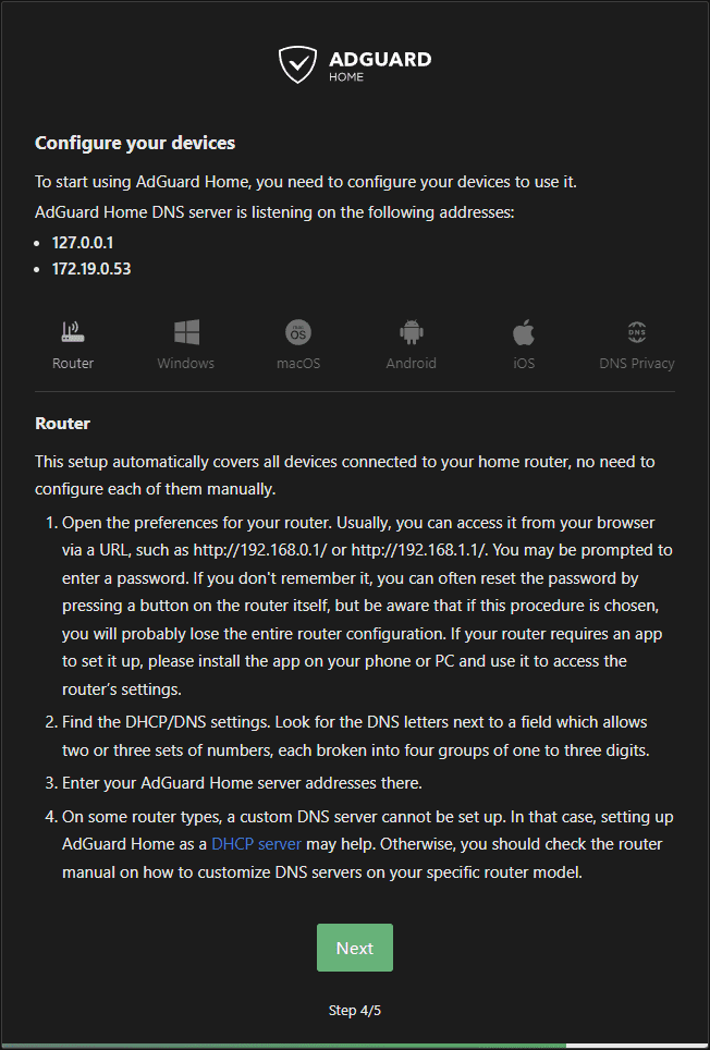 DHCP server: Enable the built-in DHCP server if needed, or configure your existing DHCP server to use AdGuard Home as the DNS resolver.